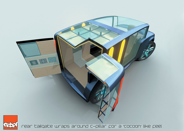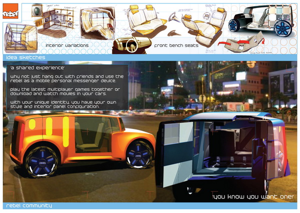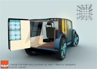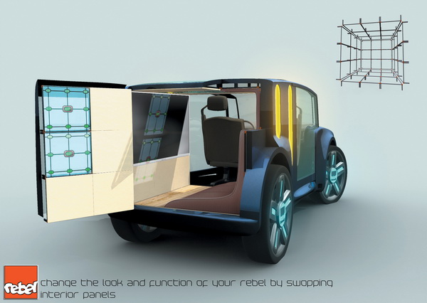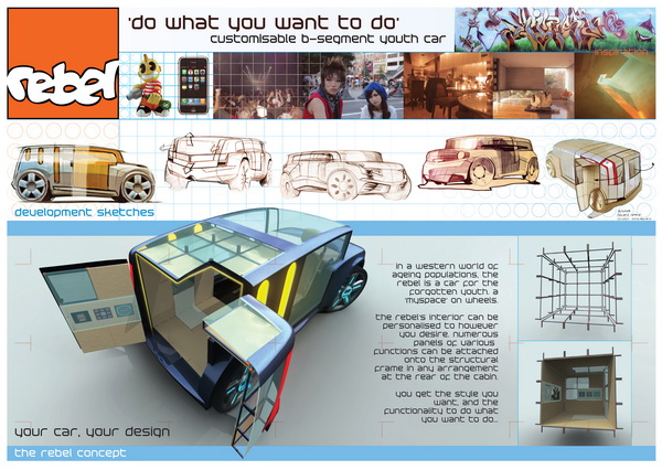 - Customizable Youth Car The interior can be personalised to however you desire. Numerous panels of various functions can be attached onto the structural frame in any arrangement at the rear of cabin. AWARDS:- Interior Motives Awards 2007 - Best Personalisation : Winner - Best Lifestyle Interior : Winner - Best Use of Ambient Lighting : Finalist |